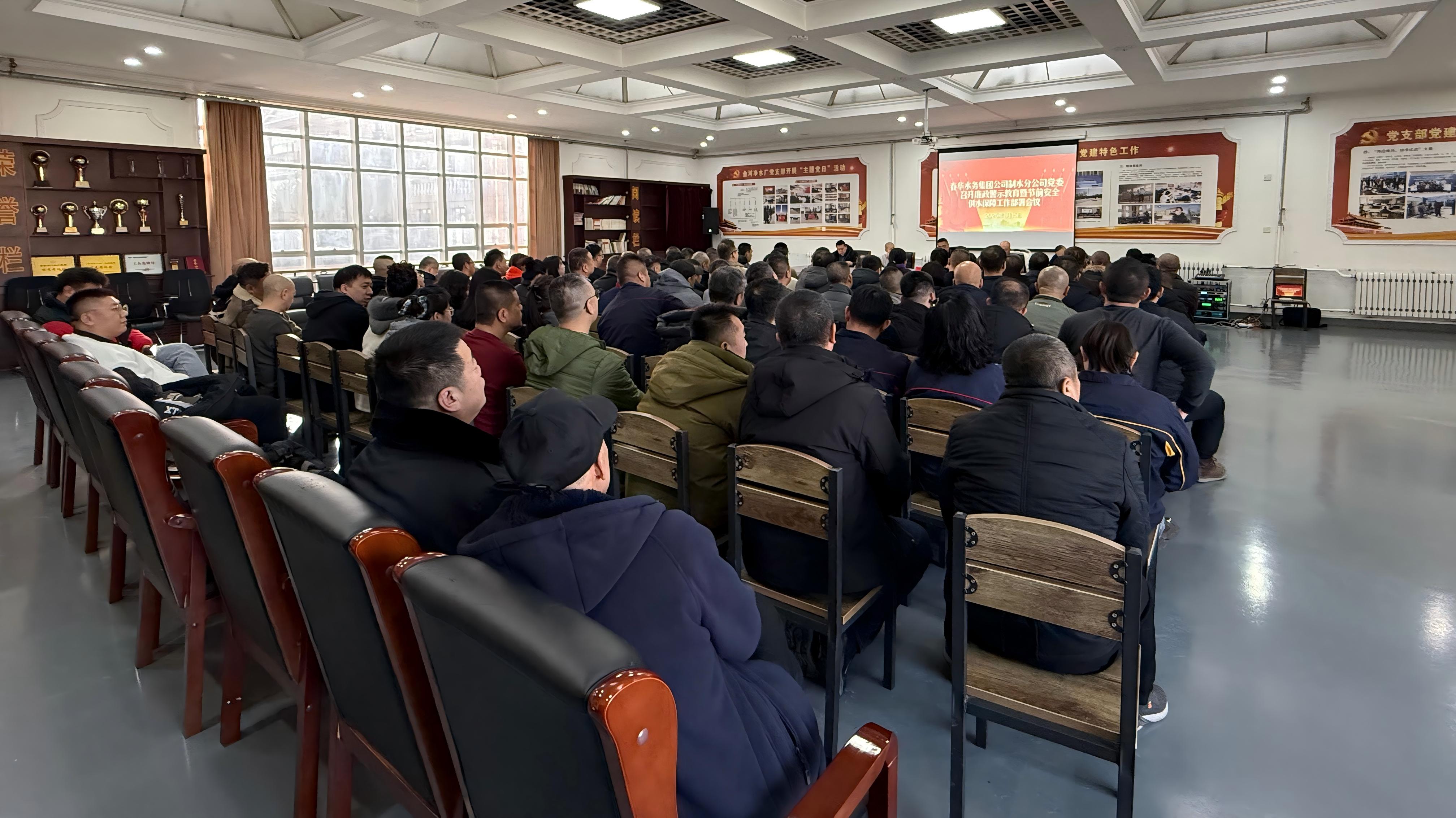 为深入贯彻全面从严治党要求,扎实筑牢节前廉洁自律防线,推动党建与业务工作深度融合,切实保障节假日期间城市供水稳定运行,1月15日,春华水务集团制水分公司党委召开廉政警示教育暨节前安全供水保障工作部署会。分公司班子成员、各职能部室、基层运营单位正副职及相关工作人员参会,共同拧紧责任链条、细化工作举措,为节日期间各项工作平稳有序开展保驾护航。